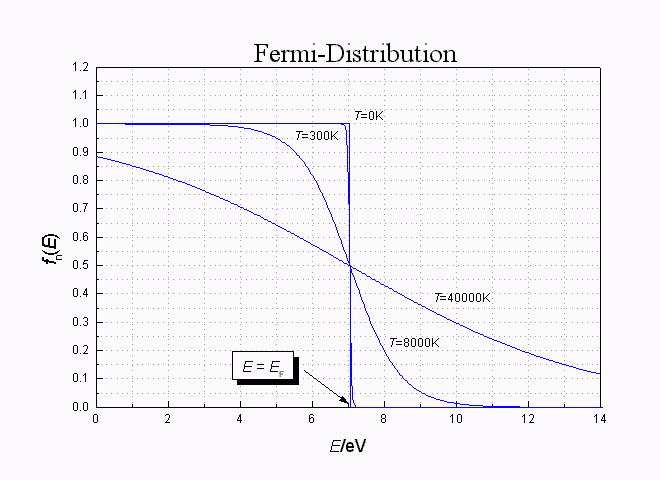 The Fermi-Distribution fn(E) = {1 + exp[(E - EF)/kT]}-1 indicate the probability if a state located at the energy E is occupied by an electron. This propability depends on temperature T. At T=0K the distribution looks like a hutch. The energy where the propability drops from 1 to 0 (at T=0K) is called the Fermi-Energy EF: